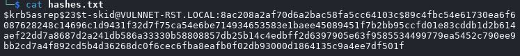 $krb5asrep$23$t-skid@VULNNET-RST.LOCAL:92fc9dbb95a6c7146027c7de371b7f61$ecad3cc8207ad3a434a66a6890525679bca9370d938d3aacd5a640e28f9a3a9ca