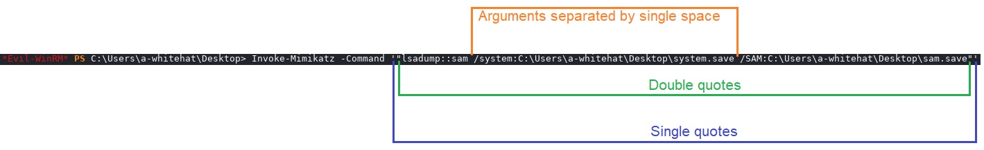 Carefully note how the command line arguments are separated by a single space and the three commands are enclosed in double quotes, and again, the whole string is enclosed in single quotes. It took me several hours to understand the right way to provide the command line argument to Mimikatz.
